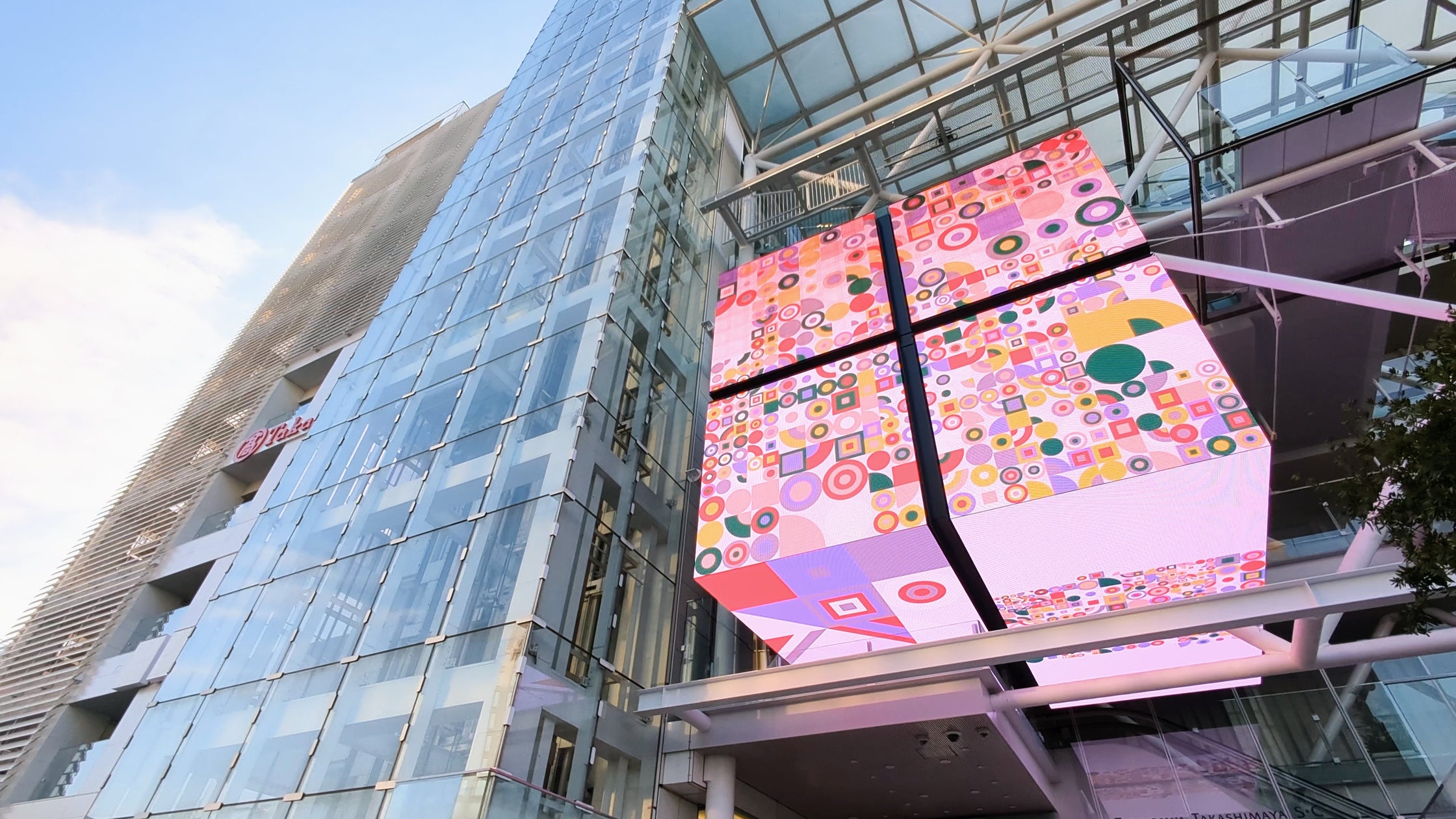 takawoさん(https://x.com/takawo)とSaeko Eharaさん(https://x.com/Sko_hr)の作品が上映されていました。キューブ型のサイネージに、気持ちよく動く作品、かっこよかった。